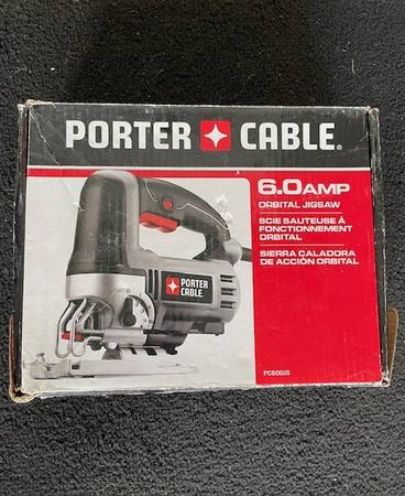 Porter Cable VS Orbital Jig Saw; trigger switch; lock-on button; saw blade locking lever; shoe sleeve; shoe; shoe beveling lever; speed control wheel; cutting action lever; LED light; 2 20mm; 3 speed. Corded electric – Model PC600Js. In excellent, clean condition. $35