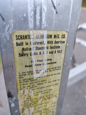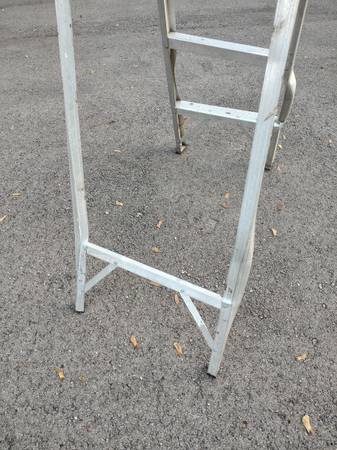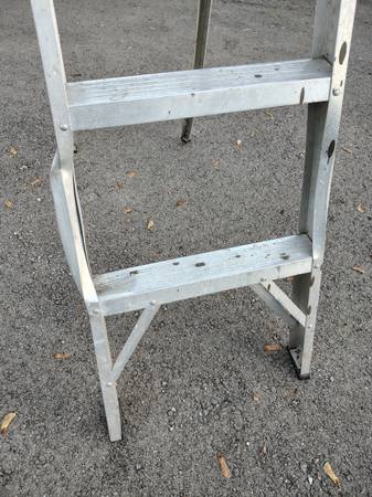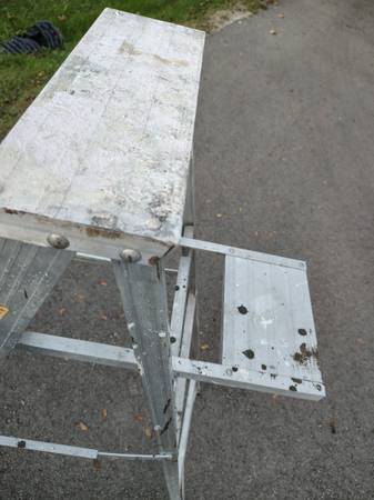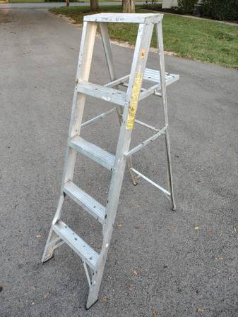 5 ft ladder. Some of the legs and lower step are a little bent...see pictures, but I continued to use the ladder like this without any problems. Has the paint bucket holder. See pictures for model sticker information. Works perfectly. Your email takes priority if you send your phone number. Tell me if you text. No deliveries.