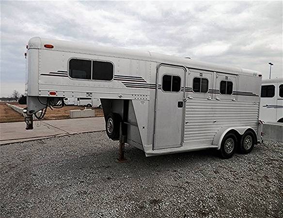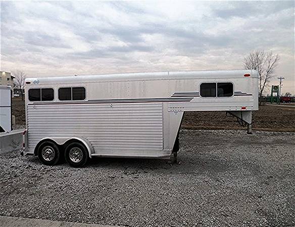 Well-built 1997 C&C 2 horse trailer gooseneck slant load 7′ wide, 14′ long, and 7′ tall.5K rubber torsion axles, electric brakes, and 225/75R15 radial tires. 52″ short wall tack room with carpeted bulkhead, collapsible rear tack, drop-down windows on the head side, and bus windows on the hip side.