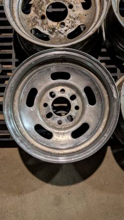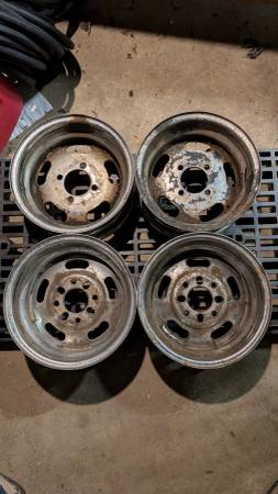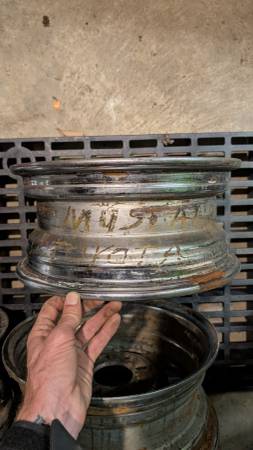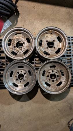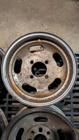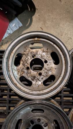 Four lug 13x6 steel wheels, Ford / Toyota patterns. Two are 4x4.5 / 4x108 only and two are also slot drilled for 4x114.3, may work for 4x100 or 4x110 also, not sure. Need a cleaning but otherwise in...