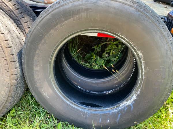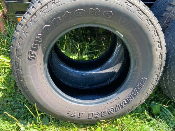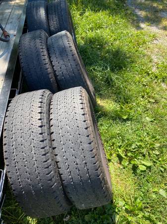 Firestone Transforce 24575R17 set of 6 from my 2014 F450, I bought the set new and ran them 40K miles, no holes or balance issues, I was making a longer trip and decided to replace them. There are 4 AT2 and 2 HT, plenty of use still available, $150 for all 6. I will answer voice calls to show contact info
