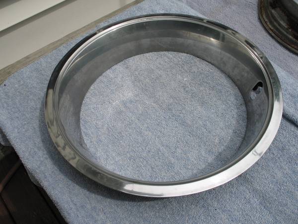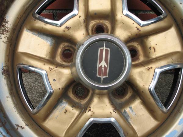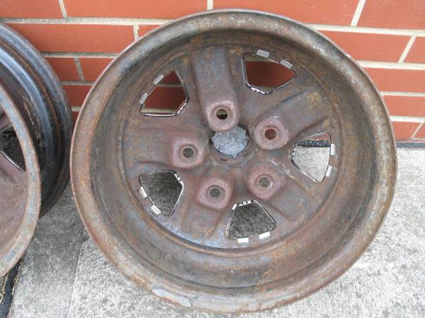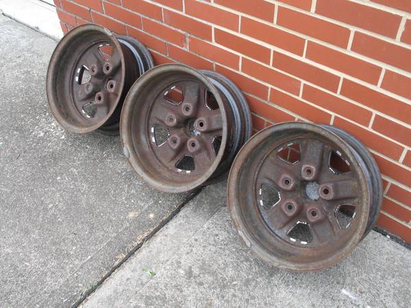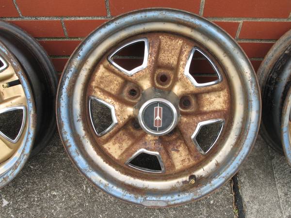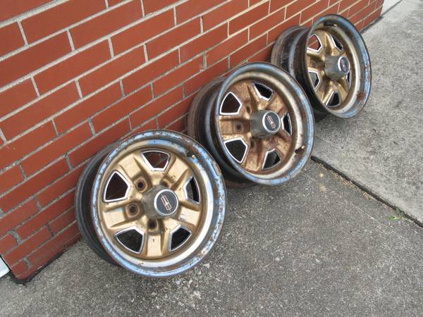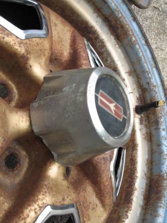 Set of three (3) original 14" GM Oldsmobile Ralley Wheels Rims, in used Condition. Wheel size is 14 x 6 NC Rim Code, 5 Lug with 4-3/4" Lug Bolt Pattern. All three rally wheels look to have been blue originally, then painted gold. All are in fair to good condition showing some scrapes, dings, pitting and surface rust, including lug nut holes on at least one rim. Stamped around valve stem area is, "M59 12 4 NC". Other stampings on the outer areas are, "M5/9 G". Stamped on the inside is "276". Stamped inside the tire rim area is, "14x6 JJ * MADE IN CANADA * 11 30 79 * Z L * 991". These are factory original Super Stock III Rallye wheels/rims. Snap in center cap opening is 2-1/8" with 5 grooved notches. Three (3) center caps and two (2) trim rings are included. All center caps have pitting; one of the trim rings has heavy rust. Back spacing measures 3-1/2" to very outer rim edge lip. $150 OBO for everything. Will ship!