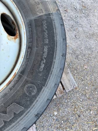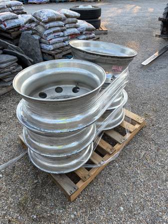 These came off a large Sterling crane truck. Couple drop axle wheels and tires that never saw much use ever. Those are steel. The rest are aluminum and just need a little polishing. 6 aluminum wheels bare and 2 front wheels and tires that are huge.As a group only