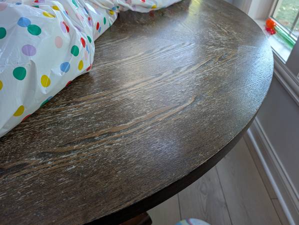 Costco Dining set table and 4 chairs. Unfortunately young kids and cats did a number on them in the past couple years. Table and chairs are good functionally but need reupholstered and tabletop refinished to be in excellent condition. These need to go as a set, not piecing out the table. 54" diameter table top.